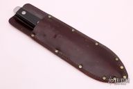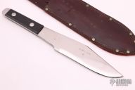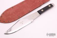 This Tru-Balance throwing bowie-axe features a mirror polished blade with false top edge, .179" blade stock and 1.964" blade depth, full tang construction. The handle has black paper micarta scales with hand peened rivets. Comes with a brown leather sheath. Has a couple light scratches, otherwise excellent condition.