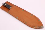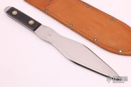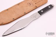 This Tru-Balance throwing Knife features a mirror polished blade with .186" blade stock and 2.061" blade depth, full tang construction. The handle has black paper micarta scales with hand peened rivets. Comes with a brown leather sheath. Has some light scratches, otherwise excellent condition.