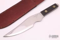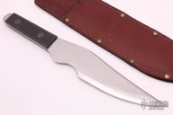 This Tru-Balance throwing Knife features a mirror polished blade with .179" blade stock and 2.176" blade depth, full tang construction. The handle has black paper micarta scales with hand peened rivets. Comes with a brown leather sheath. Has some light scratches, otherwise excellent condition.