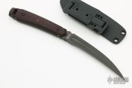 During World War II, operatives of secret units like the British SOE (Special Operations Executive) and American OSS (Office of Strategic Services) armed themselves with a wide variety of clandestine edged weapons. Some, like thumb and lapel daggers, are relatively well known, but one of the most unique was the “Tine Dagger.” Originally fashioned from the tines of pitchforks, they often had cord-wrapped handles and a series of thumb notches for a more secure grip. Intended purely for thrusting tactics, tine daggers were last-ditch, extreme-close-quarters weapons.Designed by Master Bladesmith Jason Knight, the Knight Elements Voodoo honors the spirit of the original tine dagger, while expressing it with state-of-the-art materials and style. Precision machined from N690 stainless steel, its blade features dagger-style twin bevels on one side and a hollow fuller on the other. This creates a needle-sharp point and a sturdy triangular cross section that ensure deep penetration. To ensure a non-slip grip, its full tang includes strategically located grooves and is flanked by G-10 or canvas Micarta® scales with a CNC-machined high-traction texture pattern. Every Voodoo dagger also comes complete with a custom-molded, snap-fit Kydex® sheath and a quick-release belt clip. Like classic tine daggers, the Voodoo is purpose-designed as a thrusting weapon. The subtle curve of its profile naturally complements the arc of motion of the human arm, placing the point on line with the hand to penetrate with maximum power. When employed with the tactics for which it was designed, it easily transcends the deadly efficiency of the old-school daggers that inspired it. It is also an extremely unique collector’s piece or letter opener for military historians and edged-weapon enthusiasts.