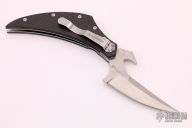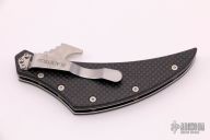 This Talon by BladeTech features a satin finish blade with false top edge and notched thumbrest. The handle has carbon fiber scales, stainless steel liners and tip down stainless steel clip, left or right reversible. Nice detent, lockup and blade seating. Excellent condition. 1 of 250.