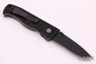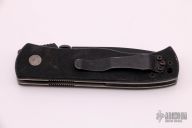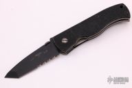 This CQC-7 from Emerson features a black partially serrated tanto blade with notched thumbrest, thumbhole and wave feature. The handle has black G-10 scales, titanium liners, black G-10 backspacer, and a tip up black stainless steel clip. Nice detent, lockup and blade seating. Has some scuffs and some small rust spots on the blade spine, otherwise good user condition. Serial Number 7056 dated 2011.