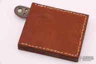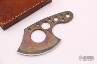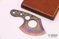 Micro hatchet made of titanium. Heat colored. Comes with a brown leather sheath. Has scuffs/scratches, otherwise good condition.