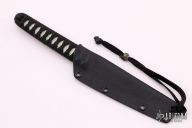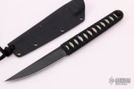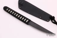 This Kwaiken Fixed Blade by Lucas Burnley features a black trailing point blade with 0.127" blade stock and 0.689" blade depth. The handle is comprised of Japanese style paracord wrap over white grip tape and hidden tang construction. Includes kydex sheath. Has a couple light scratches, otherwise excellent condition.