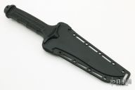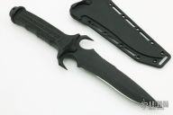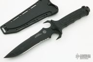 This Mark V by Masters of Defense features a black double-edged recurve blade with notched thumbrest, .225" blade stock and 1.775" blade depth, hidden tang construction. The handle is glass filled nylon with grip tape inserts. Comes with original molded plastic sheath with belt clip. Has some light scuffs, otherwise excellent condition.