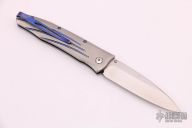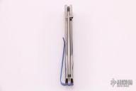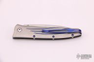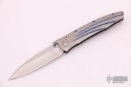 This B30 by William Henry has a satin finished blade with ZDP-189 core, single thumbstud. The frame is titanium with milled and anodized pattern. Release button and thumbstud have a sapphire inset in gold bezel. Anodized titanium pocket clip. Has some scratches, otherwise good condition. Comes with original box.