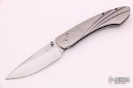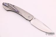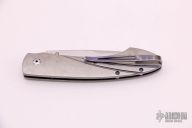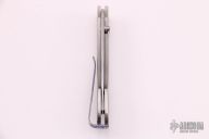 This Spearpoint button lock folding knife features a satin finish blade and a titanium frame. Sapphire inlays in thumb stud and button lock. Anodized titanium clip. Comes with original box. Has scratches, fair condition.