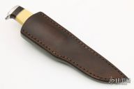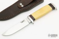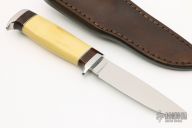 This Knife by Ken McFall features a mirror polished blade with .139" and .992" depth, hidden tang construction. The handle has a stainless steel guard and butt, vintage Westinghouse yellow paper micarta grip with black/ironwood/nickel silver spacers. Comes with a brown leather sheath. Excellent condition.