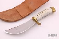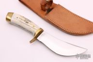 This skinner by John "Grizz" Morgan features a mirror polished blade with .087" blade stock and 1.469" blade depth, full tang construction. The handle has a brass guard and rear bolsters, elk horn scales and brass pins. Comes with a brown leather sheath. Has some light scratches, otherwise excellent condition.