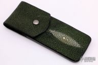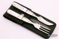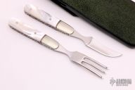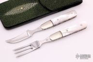 This Knife and Fork Set by Bob Jones features mirror polished blade with .119" blade stock and .658" blade depth, fileworked full tang construction. The handle has dovetailed nickel silver bolsters, mother of pearl scales with nickel silver pins, red liners, red/nickel silver spacers. Comes with a matching fork. The set comes with a stingray skin leather case. Excellent condition.