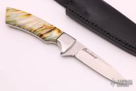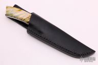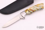 This piece by Gaetan Beauchamp features a hand rub satin finished blade with full tang construction, .139" blade thickness and 1.165" blade depth. The handle has dovetailed mirror polished stainless bolsters, and mammoth tooth scales with black liners.  Nicely contoured handle. Comes with a black leather sheath. Excellent condition.
