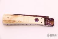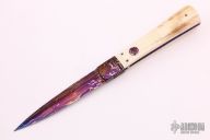 This side opening auto by Rainy Vallotton features a spear point blued Damascus blade with a false top edge and fileworked spine. The handle has blued Damascus fluted bolsters, matching Damascus button, fluted mammoth ivory scales, anodized and fileworked titanium liners, and a stainless steel fileworked backspacer. Excellent condition.