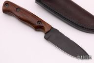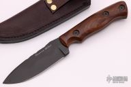 This Huntsman by Dawson Select features a black blade with notched thumb and finger rests, fileworked spine, .191" blade stock and 1.283" blade depth, full tang construction with wood scales. Comes with a brown leather sheath, original box and COA. Excellent condition.