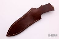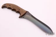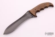 This Playdough Knife from Forge Master K. Ali is a Modell Design, it features a Black TiNi coated blade with false top edge and notched thumbrest, .215" blade stock and 1.625" blade depth, full tapered tang construction. The handle has brown canvas micarta scales. Includes brown leather sheath and original box. New from maker. The name of this knife came from the design process where playdough was used while wearing tactical gloves to model the handle.