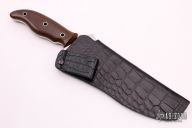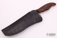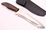 This Equatorian from Mercworx features a hand rub satin finished spear point recurve blade with sharpened top edge and notched thumbramp, .247" blade stock and 2.514" blade depth, full tang construction. The handle has brown canvas micarta scales. Includes a black leather and kydex sheath. Excellent condition. Comes with a zippered case.