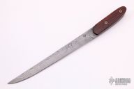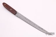 This tanto from Stek Knives features a Damascus blade with .206" blade stock and 1.050" blade depth, full tang construction. The handle has cocobolo scales with mosaic pins. Excellent condition. Comes with a zippered case.