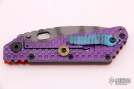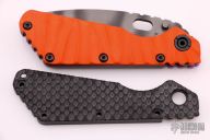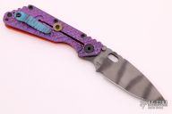 This SMF framelock folder by Strider features a tiger stripe blade with thumbhole and notched thumbrest. The handle has a custom orange G-10 scale by Cacudi Design - Custom Scale Division, and a custom anodized gunner grip titanium frame, custom anodized tip up titanium clip. Includes a .45 Auto "Lock Bar Stabilizer" for maximum reverse lock retention. Nice blade seating. Has a light scuff on the clip, a little vertical blade play and a soft detent, otherwise good condition. Comes with original black G-10 gunner grip scale and lockbar stabilizer.