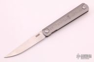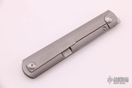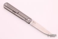 This Slim Urban Tactical Gentleman's folder by Michael Zieba was designed by Ostap Hel. It features a stonewash finished blade with notched thumbrest and front flipper. The handle has a bead blasted titanium frame with matching tip up clip (knife is clipped for left handed carry, but lock is set up for right handed carry), has a single barrel spacer and stainless steel hardware. The a-side of the handle has a depiction of a skyline. Nice detent, lockup and blade seating. Has ball bearing washers and a ceramic detent ball. Limited run of 120 pieces. Comes with leather zippered case. #075 on tang of blade. Excellent condition.