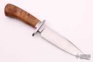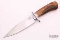 This knife by Jouneyman Smith JJ Simon was one of his Journeyman Smith Test Knives. It features a hand rub satin finished blade with false top edge and nice hamon, .293" blade stock and 1.460" blade depth, hidden tang construction. The handle has a stainless steel guard and collar with brass spacer, wood grip and brass pin. New from maker at the 2021 Blade Show.