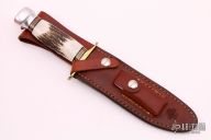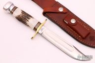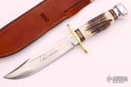 This limited edition Marbles Bowie features a clip point blade with deep fuller, .256" blade stock, 1.305" blade depth. Hidden tang construction with brass guard, stag handle, and aluminum pommel, black/brass/red/white spacers. Numbered 1 of 50 and marked "Custom 2003".  Includes original leather sheath and box.  Excellent condition.