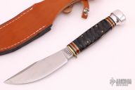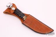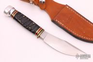 This Woodcraft by Marbles features a satin finished blade, .210" blade stock and 1.239" blade depth, hidden tang construction. The handle has a brass guard with impala horn grip and black/white/brass/red spacers and aluminum cap. Comes with original brown leather sheath and box. Has some light patina, otherwise excellent condition.