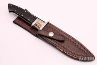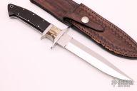This Sub-Hilt Fighter by Tim Hartman features a mirror polished blade with false top edge, .174" blade stock and 1.076" blade depth, full tapered tang construction. The handle has mirror polished 416 stainless steel guard and sub-hilt, stag and buffalo horn scales with nickel silver pins and lanyard hole. Comes with a hand tooled brown leather sheath. Has a few light scratches, otherwise excellent condition. Comes with zippered case and COA #215