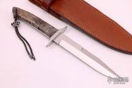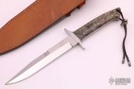 This First Strike Fighter by Tim Hartman features a mirror polished blade with false top edge, .175" blade stock and 1" blade depth, full tapered tang construction. The handle has mirror polished 416 stainless steel guard, buckeye burl scales with stainless steel pins and lanyard hole. Comes with a brown leather sheath. Has a few light scratches, otherwise excellent condition. Comes with zippered case and COA #217.