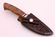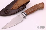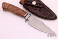 This hunter by Journeyman Smith Scott Gallagher features a hand rub satin finished blade with false top edge, .212" blade stock and 1.346" blade depth, hidden tang construction. The handle has a satin finished stainless steel fluted guard, maple burl grip. Comes with a hand tooled brown leather sheath made by Kenny Rowe. Comes with COA dated 3/13/2018 and a zippered case.