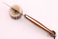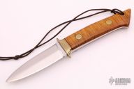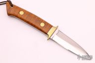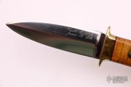 This Dagger by the late Jimmy Lile features a satin finished double-edged blade with .189" blade stock  and 1.013" blade depth, full tapered tang construction. The handle has a brass guard, wood scales with red liners and brass pins. Includes a zippered case. Blade is signed"Hand Made by James B. Lile". Has a few light scratches, may have been resharpened, otherwise excellent condition.