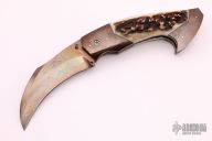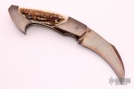 This Rastor by Reese Weiland features a colored Damascus hawkbill style blade with single thumbstud. The handle has matching Damascus bolsters, anodized liners with jeweled interiors, stag scales, and a Damascus backspacer. Nice detent, lockup and blade seating. Comes with a zippered case. Excellent condition.