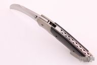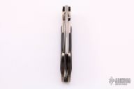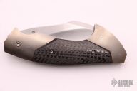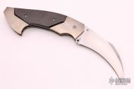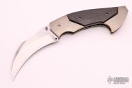 This linerlock Rastor by Reese Weiland features a hand rub satin finished hawkbill style blade with a single checkered thumbstud. The handle has orange peel finished and anodized titanium double bolster, anodized and jeweled titanium liners, carbon fiber scales, fileworked stainless steel backspacer. Nice detent, blade seating and lockup. Comes with zippered case. Excellent condition.