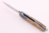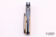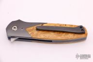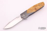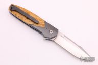 This "Version" linerlock flipper by Joel Chamblin features a hand rub satin finished blade with notched thumbrest and a flipper. The handle has zirconium bolsters, Box Elder Burl wood scales, anodized titanium liners and a zirconium tip up clip. Rides on bearings, nice detent, lockup and blade seating. Excellent condition. Comes with a zippered case and COA dated 3-22-16.