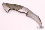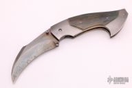 This Rastor by Reese Weiland features a colored Damascus hawkbill style blade with single thumbstud. The handle has matching Damascus bolsters, anodized liners with jeweled interiors, mammoth ivory scales, and a Damascus backspacer. Nice detent, lockup and blade seating. Comes with a zippered case. Excellent condition. #002 inside the backspacer.