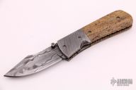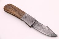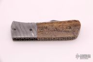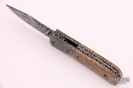 This Mini Harpoon linerlock by Mark Nevling features a Random Pattern Damascus (1084 and 5160) harpoon style blade with file work on blade spine and single thumbstud. The handle has Twist Damascus bolsters, fossil oosic scales, fileworked and anodized titanium liners, fileworked San Mai Damascus backspacer. Nice lock up, blade seating and detent. Comes with a nylon zippered case, water buffalo leather slip sheath and COA dated 3/4/17. Excellent condition.