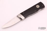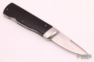 This Rolox Diamondback from Benchmark features a satin finish blade with notched thumbrest. The blade has been polished and resharpened. Opening mechanism pushes blade up and out the front, then locks. Stainless steel liners and bolsters, black wood scales. Comes with original nylon sheath. Has some scratches and dings, otherwise good condition.