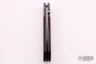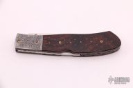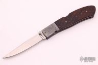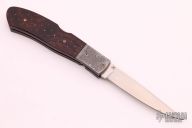 This Mid-Lock by Ralph Turnbull features a hand rub satin finished blade with a single thumbstud with opal inlay. The handle has Damascus bolsters, ironwood scales with black checkered lines and silver pin inlays, fileworked anodized titanium liners, stainless steel and black G-10 backspacer. Comes with a zippered case. Excellent condition. Made in 2015.