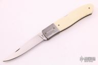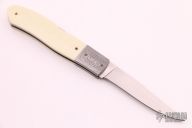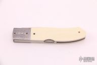 This Mid-Lock by Ralph Turnbull features a hand rub satin finished blade with nail nick. The handle has Damascus bolsters, walrus ivory scales, stainless steel liners, stainless steel and black G-10 backspacer. Comes with a zippered case. Has a few light scratches, otherwise excellent condition.