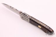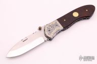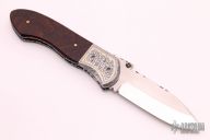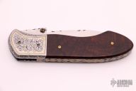 This Linerlock Folder from Gene Baskett features a mirror finished drop point blade with satin finished flats, fileworked spine/tang and bronze anodized single titanium thumbstud. The handle is comprised of engraved steel bolsters with gold inlays, ironwood scales with Indian Head medallion over fileworked and anodized titanium liners and backspacer. Excellent condition. Comes with a zippered case.