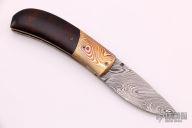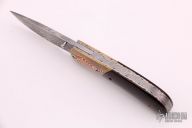 This knife by Nico Pelzer features a Damascus blade with a single thumbstud. The handle has mokume bolsters, desert ironwood scales, fileworked and anodized titanium liners, Damascus backspacer. Comes with stingray skin zippered case. Excellent condition.