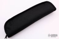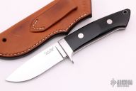 This Hunter by Charles Vestal features a mirror polished drop point blade, .178" blade stock and 1.079" blade depth, full tapered tang construction. The handle is comprised of a stainless steel guard and black linen micarta scales over red fiber liners, lanyard tube in pommel. Includes a hand tooled brown leather sheath with belt loop. Excellent condition. Comes with a zippered case.