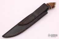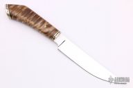 This Hunter from Ralph Turnbull features a mirror polished blade with .185" blade stock and 1.104" blade depth, hidden tang construction. The handle is comprised of a nickel silver guard and butt with fileworked brass spacer, curly maple girp with a brass pin. Includes a hand tooled black leather sheath with belt loop. Excellent condition.