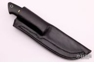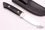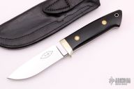 This Loveless Style Drop Point by Terry Knipschield features a mirror polished drop point blade, .183" blade stock and 1.089" blade depth, full tapered tang construction. The handle has a nickel silver bolster, black linen micarta scales, red liners and a lanyard hole. Comes with a black leather sheath. Excellent condition.