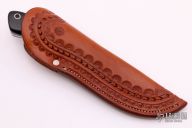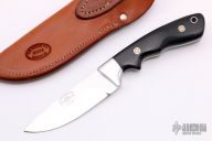 This hunter by Larry Durand features a mirror polished drop point blade, .104" blade stock and 1.077" blade depth, full tang construction. The handle has mirror polished dovetailed stainless steel bolsters, black paper micarta scales with mosaic pins and a lanyard hole. Comes with a hand tooled brown leather sheath. Has a few light scratches, otherwise excellent condition. #2699 on the blade.