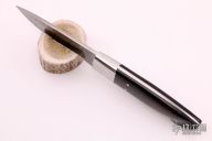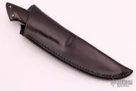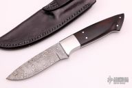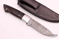 This Hunter from Ed VanHoy features a Damascus drop point blade with .131" blade stock and .973" blade depth, full tapered tang construction. The handle has dovetailed stainless steel bolsters and ironwood  scales with stainless pins. Has a small chip in the butt of one of the scales, otherwise excellent condition.