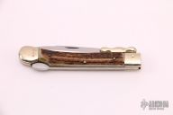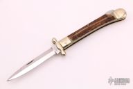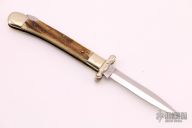 This Medici by Puma features a mirror polished spear point blade with false top edge, nail nick, and a nickel silver swing guard. The handle has nickel silver bolsters, front and rear, stag scales, brass liners. Comes with a brown leather sheath. Has a few light scratches, otherwise excellent condition.