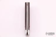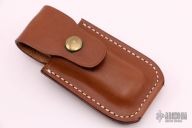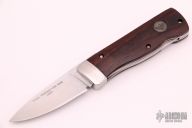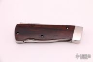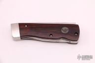 This Rolox Diamondback from Benchmark features a chisel ground, satin finish blade with swedge and cocobolo handle. Opening mechanism pushes blade up and out the front, then locks. Stainless steel liners and stainless steel bolster. Comes with original box and sheath. Has some scratches, otherwise good condition.