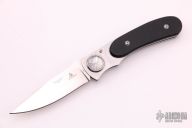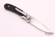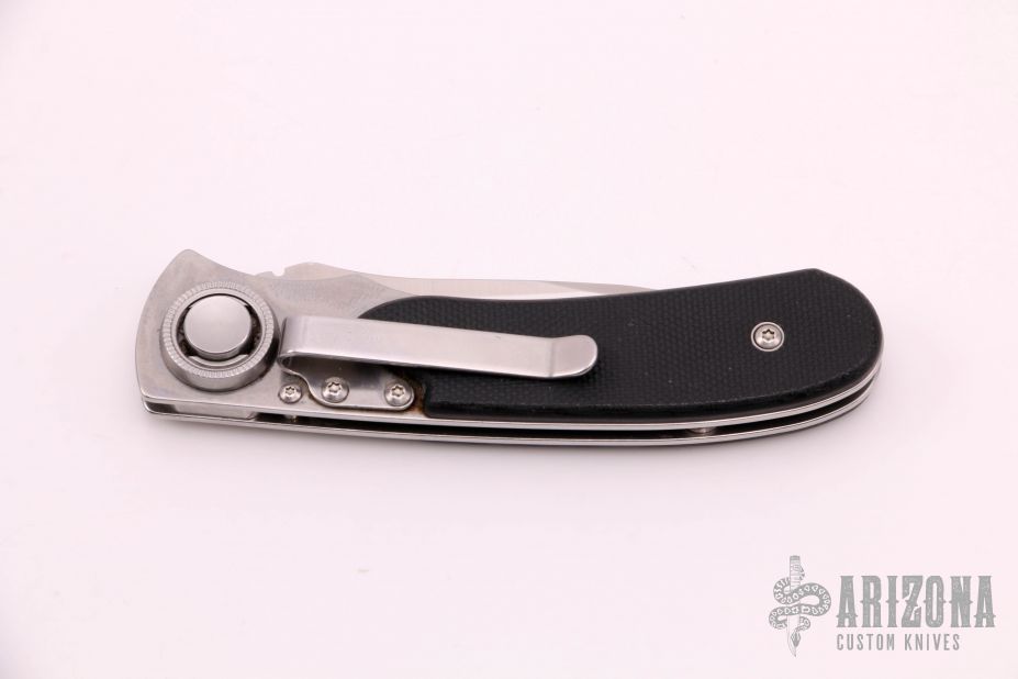 This Paul Prankster has a satin finished 154 CM stainless steel clip point blade with notched thumb rest. Handle is black G-10 over stonewashed stainless steel frame. Stainless steel tip down clip. Excellent condition. Very nice piece.