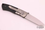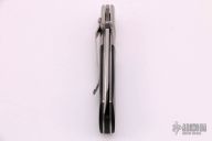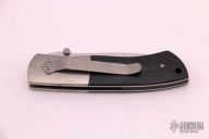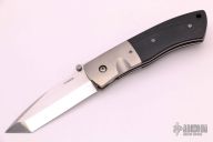 This knife by Joel Chamblin features a hand rub satin finished chisel ground tanto blade with notched thumbrest and dual checkered thumbstuds. The handle has bead blasted and dovetailed titanium bolsters, black G-10 scales, bead blasted titanium liners, black G-10 backspacer, tip down bead blasted titanium clip. Has some scratches, otherwise good condition.