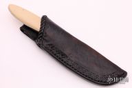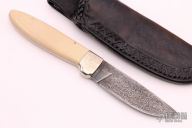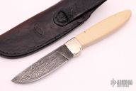 This knife by Tim Britton features a Damascus blade, .151" blade stock and 1.075" blade depth, full tang construction. The handle has nickel silver bolsters, ivory paper micarta scales and nickel silver pins. Comes with a black leather sheath. Has some light scratches, otherwise good condition.