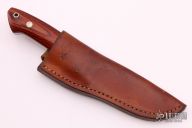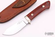 This Hunter by Wayne Clay features a mirror polished blade with a tapered tang construction.  .189" Blade Stock.  1.376" Blade Depth.  The handle features a nickel silver guard with wood scales over red liners.  Includes a brown leather sheath.  Scuffs/scratches are visible on the blade and handle otherwise the knife is in fair condition.